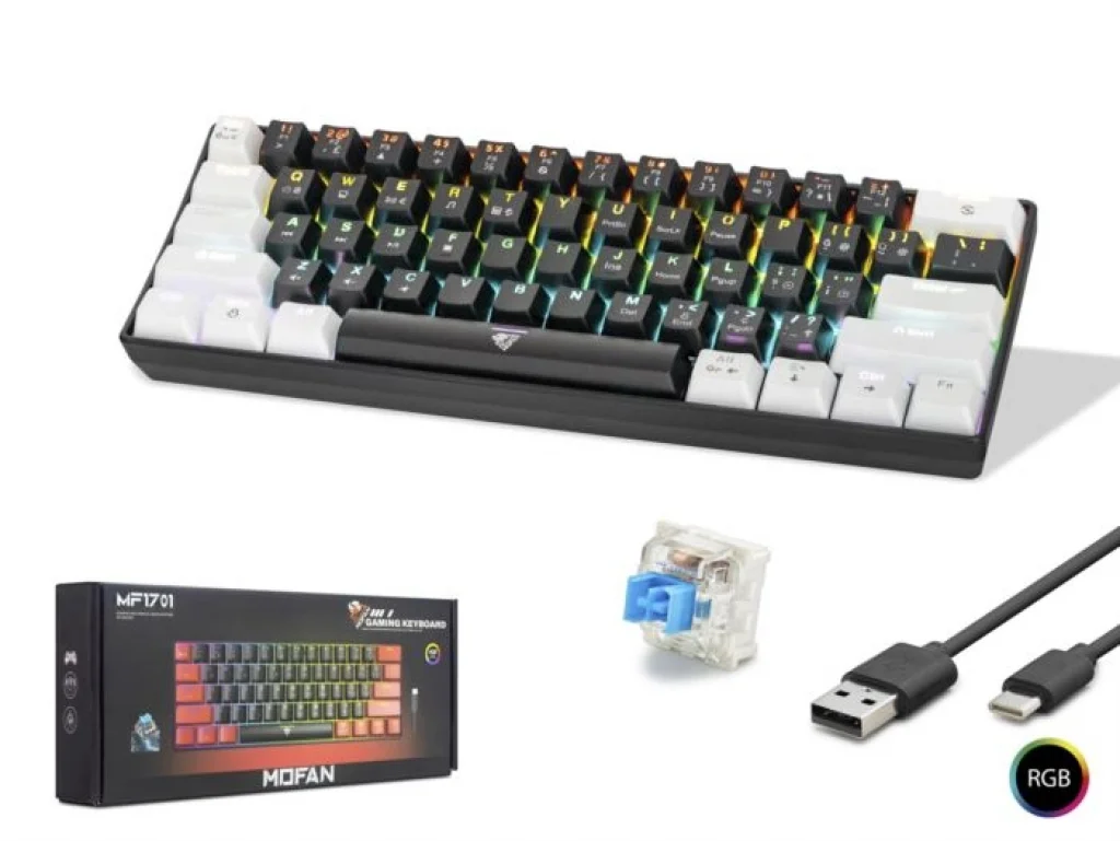 MOFAN MF1701BW, modern Siyah-Beyaz renk kombinasyonu ve minimalist 61 tuşlu (60% Layout) tasarımıyla masanızda hem estetik hem de işlevsellik sağlar. Profesyonel Blue Drinkey Switch anahtarları, 50 milyon vuruşluk kullanım ömrüyle dayanıklılığı garantilerken, her basışta hissedilen net mekanik tepkime oyun performansınızı artırır. 10 farklı Rainbow aydınlatma moduyla zenginleşen bu model, kompakt yapısı sayesinde taşınabilirlik ve geniş mouse hareket alanı arayan oyuncular için idealdir.
