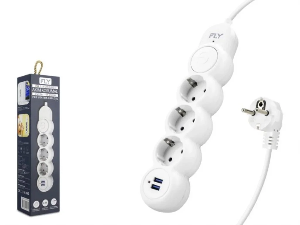 Fly 3393-01, teknoloji odaklı yaşam alanları için tasarlanmış, akıllı bir enerji yönetim istasyonudur. 2 metre uzunluğundaki kablosuyla esneklik sağlayan bu ürün, 3 adet standart topraklı prizin yanı sıra 2 adet USB (2.1A) çıkışı sunarak akıllı telefon, tablet ve kulaklıklarınızı adaptör gerektirmeden doğrudan şarj etmenize olanak tanır.